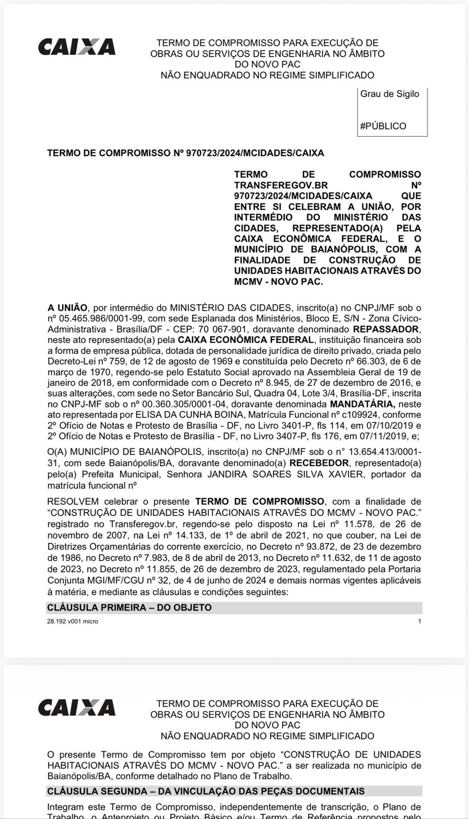 O TERMO DE COMPROMISSO Nº 970723/2024/MCIDADES/CAIXA foi celebrado entre a União, por intermédio do Ministério das Cidades, representado pela Caixa Econômica Federal, e o Município de Baianópolis AINDA NA GESTÃO ANTERIOR.