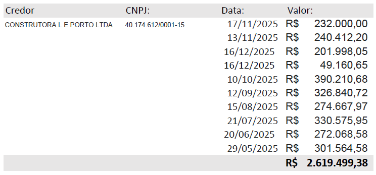 Somente para a Construtora L e Porto Ltda, constam repasses que somam R$ 2.619.499,38, entre maio e dezembro de 2025.